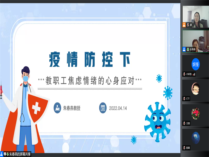 4月14日,校教职工心理健康服务中心邀请太阳成集团122ccvip副经理朱春燕教授,以“疫情时期的焦虑情绪应对”为主题,为全校职工开展了一场线上公益讲座,提醒广大教职工做好“心理防疫”。全校500余名教职工线上参加活动。